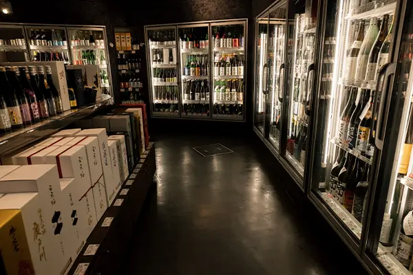 地下へ降りて行くとワインコーナーともう一つ 日本酒コーナーがあります。 日本酒も生き物です。 光や温度にとても敏感なお酒です。だから地下なのです。 私たちのこだわりの証です。 地下は年中18度に設定され お酒にとって良い環境の温度を実現。 ひんやりとした空間は長時間悩まれる方にも居心地の良い空間です。