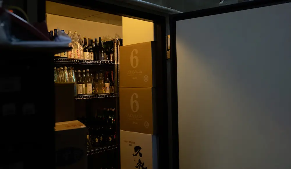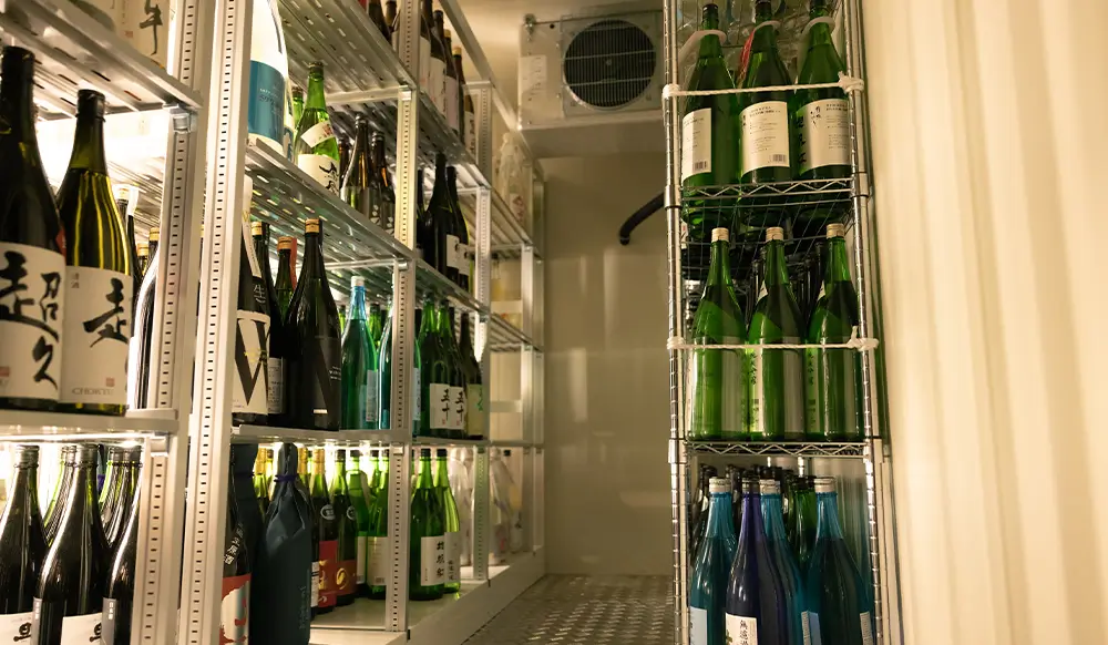 プレハブ冷蔵庫内は日本酒専用となっていて 温度は0度に設定されています。 蔵元から送られてきたお酒は直ぐにここに入れられます。 徹底した温度管理です。 ここでは普通の冷蔵庫ではできない長期熟成も可能です。